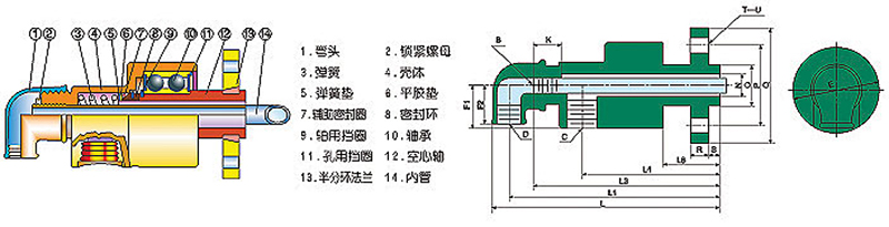 HS 型双向流通式旋转接头:又可细分为 HS-G 型双向流通内管固定式旋转接头和 HS-X 型双向流通内管旋转式旋转接头。HS-G 型多用于蒸汽类型,滚筒内装有不同型式的虹吸管,将冷凝液排出;HS-X 型用于内管与滚筒相对固定在一起并随滚筒同步运转的结构,流体由内管导入,外管排出。
