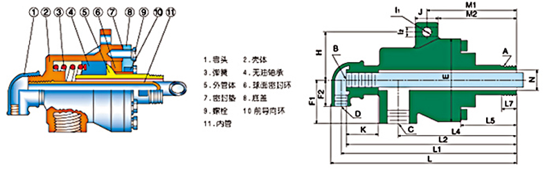 外管体结构:外管体直接接到辊子或烘筒上,是主要的旋转部件,且经过精加工形成球面。底盖和浸渍石墨球面密封环共同组成密封可靠的动密封摩擦副,球面密封环在壳体内的环形空间中滑动。