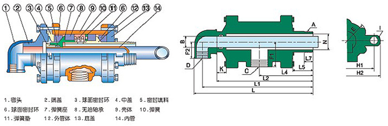 外管体结构:外管体直接接到辊子或烘筒上,是主要的旋转部件,且经过精加工形成球面。底盖和浸渍石墨球面密封环共同组成密封可靠的动密封摩擦副,球面密封环在壳体内的环形空间中滑动。