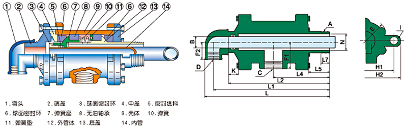 外管体结构:外管体直接接到辊子或烘筒上,是主要的旋转部件,且经过精加工形成球面。底盖和浸渍石墨球面密封环共同组成密封可靠的动密封摩擦副,球面密封环在壳体内的环形空间中滑动。